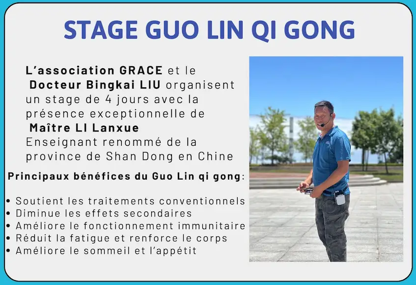 Le Qi Gong GuoLin est une pratique spécifique développée pour accompagner les personnes vivant avec un cancer ou une maladie chronique. Chez GRACE, il est enseigné dans le strict respect du parcours de soins conventionnels et vise à améliorer la qualité de vie des patients. Les séances sont encadrées par le Dr Bing Kai LIU et une équipe expérimentée, composée de personnes en rémission ou dans un état de santé stable, pratiquant quotidiennement ce qi gong adapté au cancer.